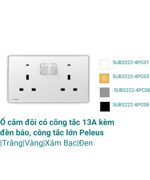 Ổ cắm đôi có công tắc 13A kèm đèn báo, công tắc lớn Peleus