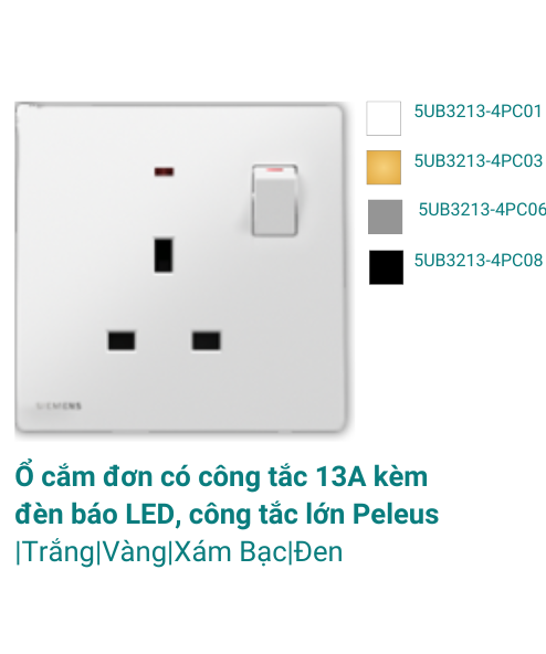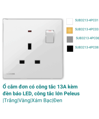 Ổ cắm đơn có công tắc 13A kèm đèn báo LED, công tắc lớn Peleus